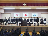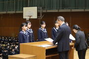 12月24日 本日をもって、77日間の2学期が終了しました。残暑の残る中で迎えた2学期の始業式でしたが、終業式の今日は雨が降り、身にしみるような寒さとなりました。式では、多くの生徒の皆さんが表彰され、2学期の努力がしっかりと形になったことを大変うれしく思いました。部活動、学習、さまざまな場面での活躍は、学校全体の誇りです(写真は一部)。また、生徒会を中心に各クラスで話し合って作成した「いじめ撲滅宣言」の発表も行いました。一人一人が「いじめを許さない」という強い気持ちを共有できた、意義深い時間となりました。さらに、早めに体育館へ行き、寒さの中で準備を整え、会場を温めてくださった先生方にも感謝申し上げます。皆さんの支えがあって、生徒たちは安心して式に臨むことができました。どうぞ冬休みは健康と安全に十分気をつけ、3学期にまた元気な姿で会いましょう。